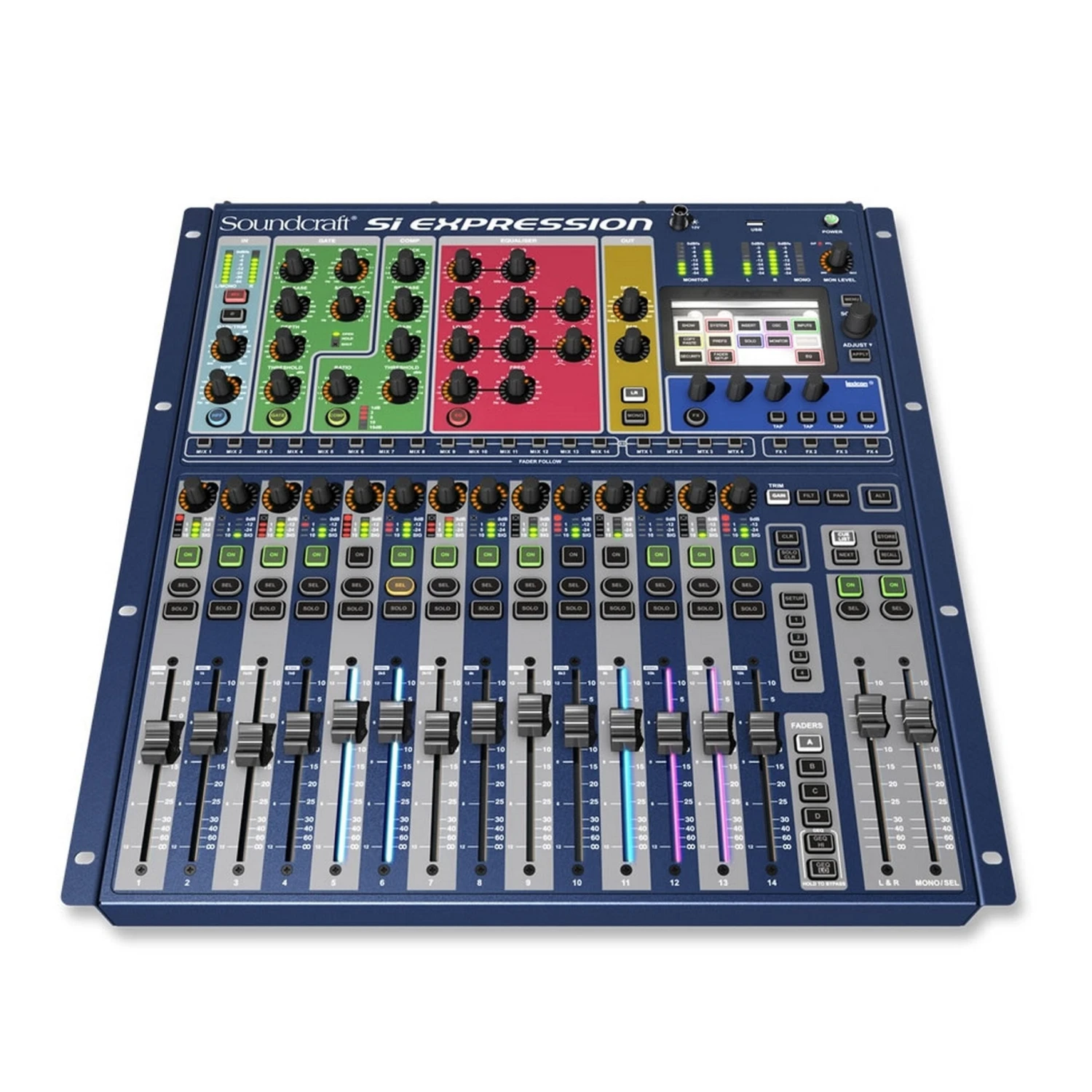 - Soundcraft FaderGlow – Illuminates the fader slots according to function with clearly defined colours for FX, Stereo, Linked Mono, GEQ, POST Fade Aux, PRE Fade Aux; you’ll never be lost again!